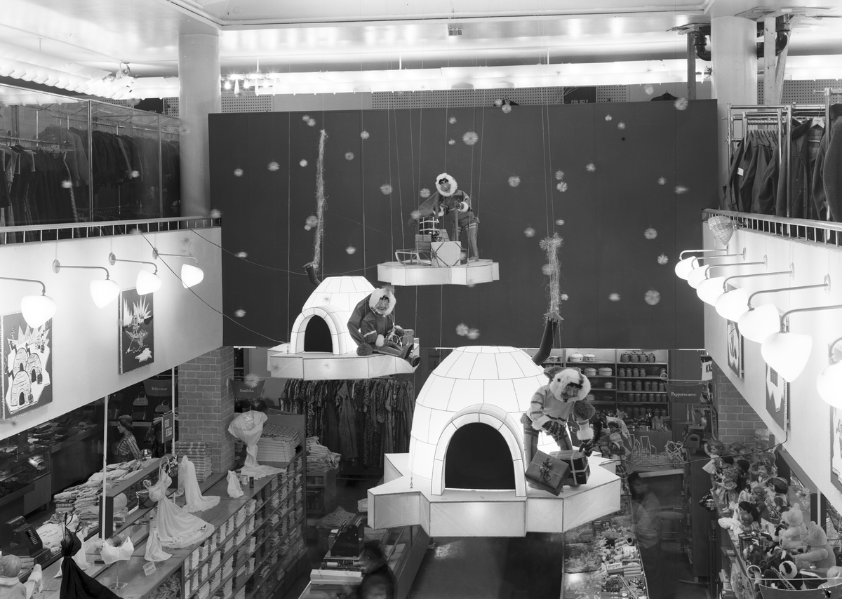 Konsum Alfa Varuhuset. Juldekorationerna föreställer igloos. Den 8 januari 1955.