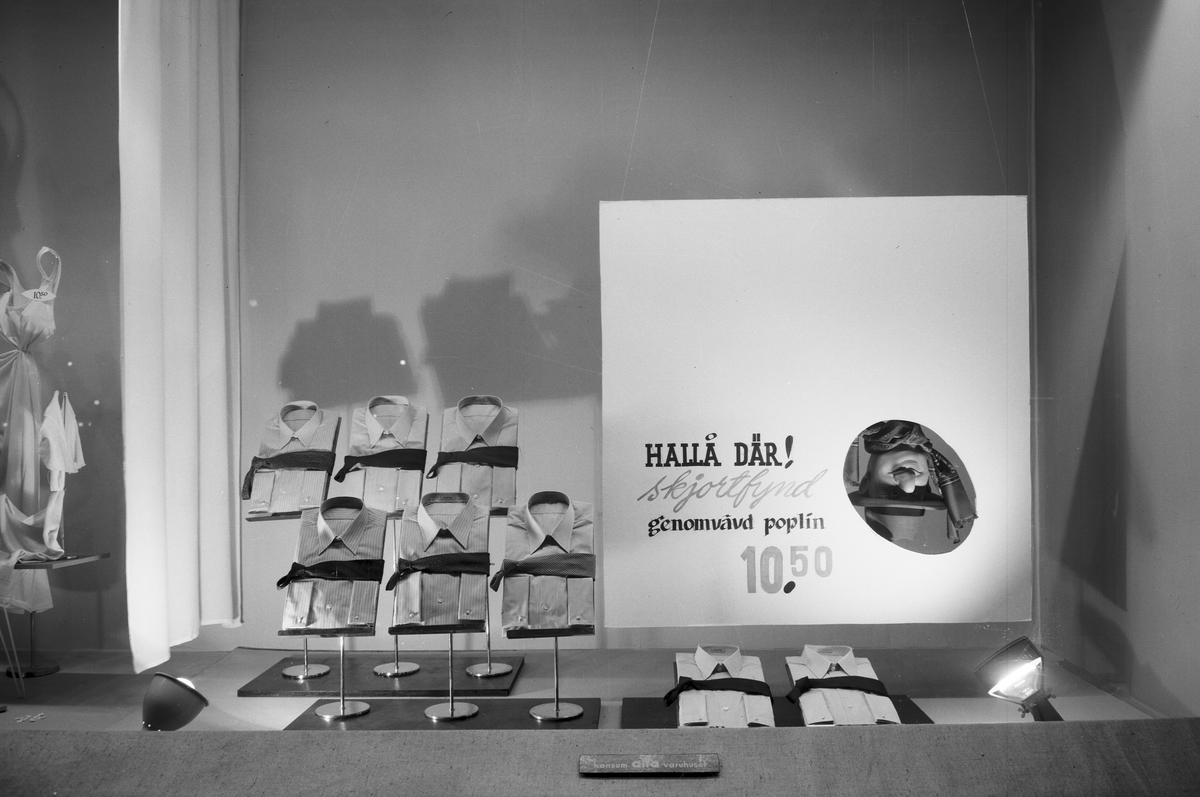 Konsum Alfa Varuhuset. Skyltfönstertema "Hallå där! Skjortfynd". Den 2 februari 1955.