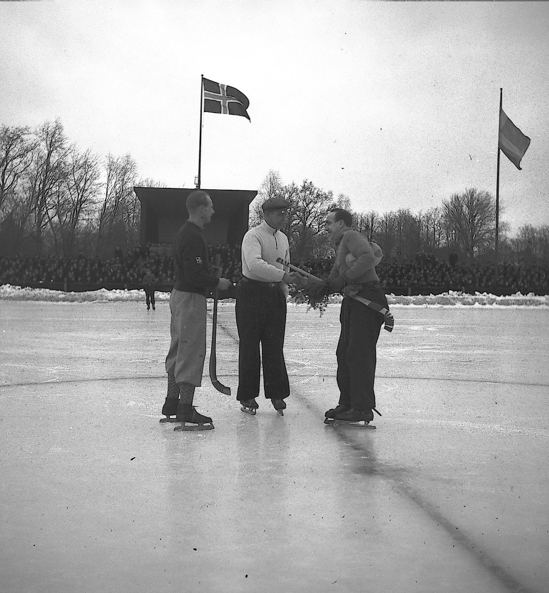 Bandylandskamp Sverige - Norge på Strömvallen. Till höger lagkapten "Bissen" Lindberg. Reportage för Gefle Dagblad