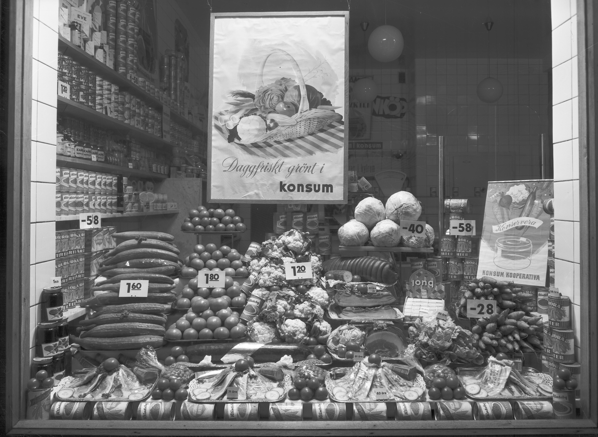 Konsumbutik. Skyltfönstertema "Daggfriskt grönt i Konsum"