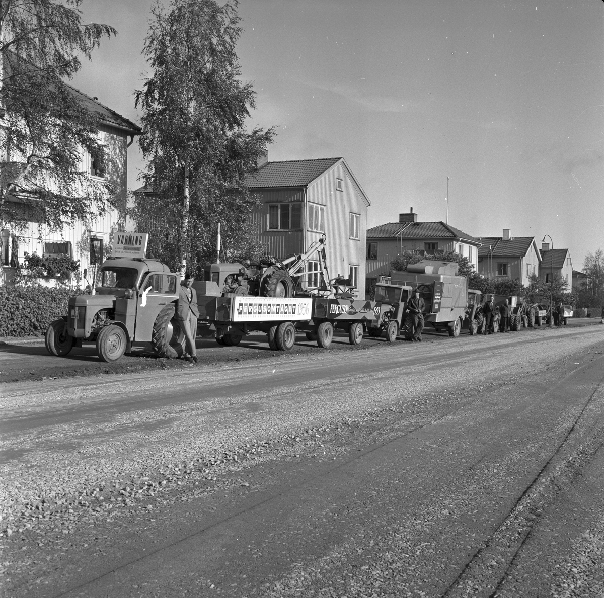 Traktorer parkerade på Hälsingegatan i Gävle. Reportage av Tollertz, Norrlands-Posten den 2 oktober 1956.