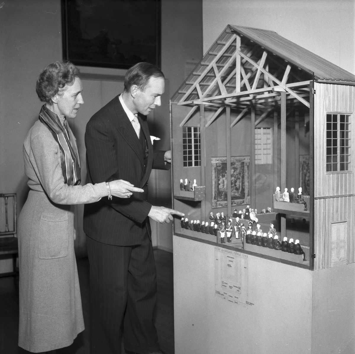 Museet. 1 december 1954. Fru Berggren och Folke Löfgren granskar modell. Reportage för Norrlands-Posten.