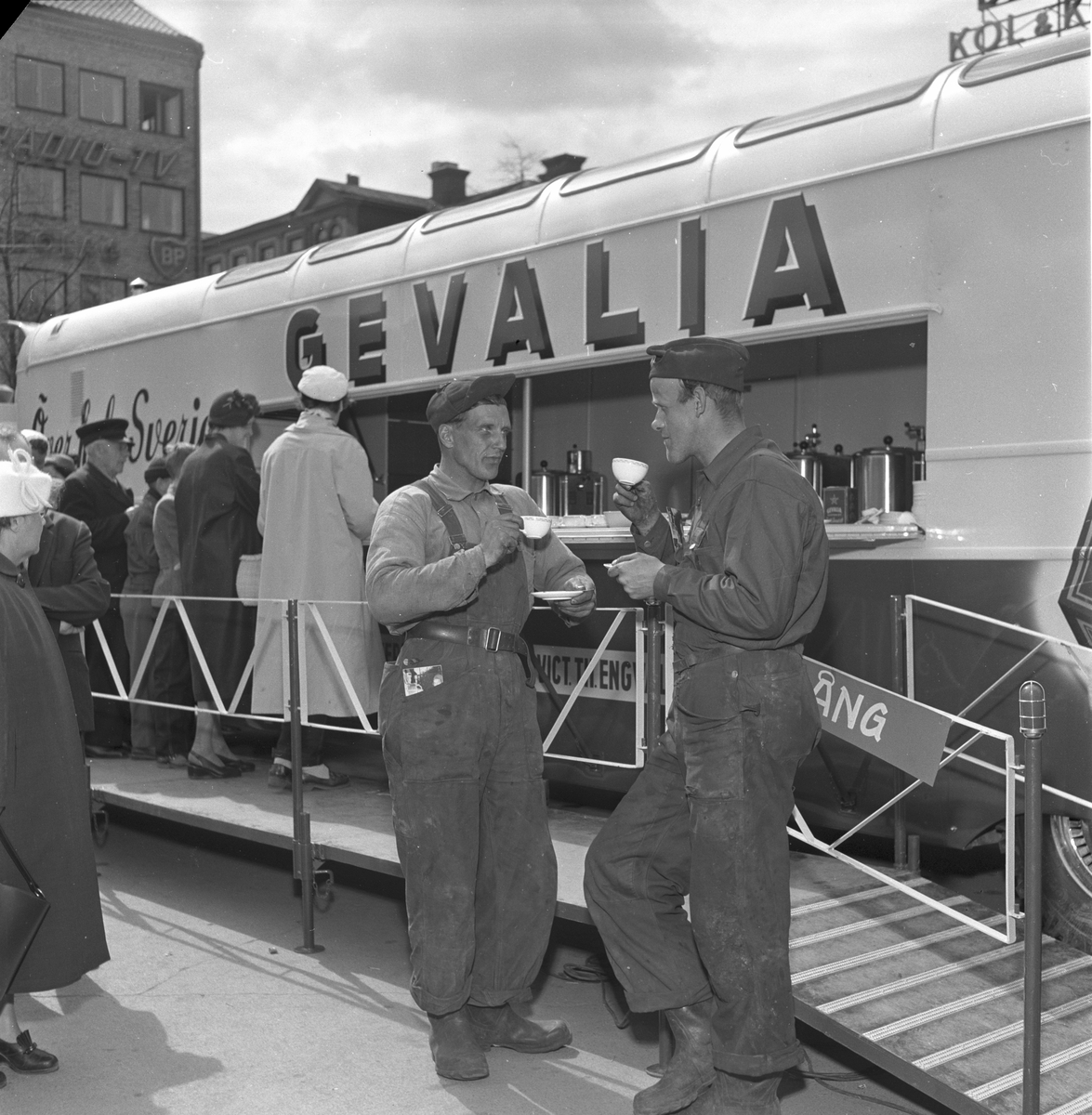 Engwall & Co. 16 maj 1956. Gevalia på busstorget, kaffeservering.