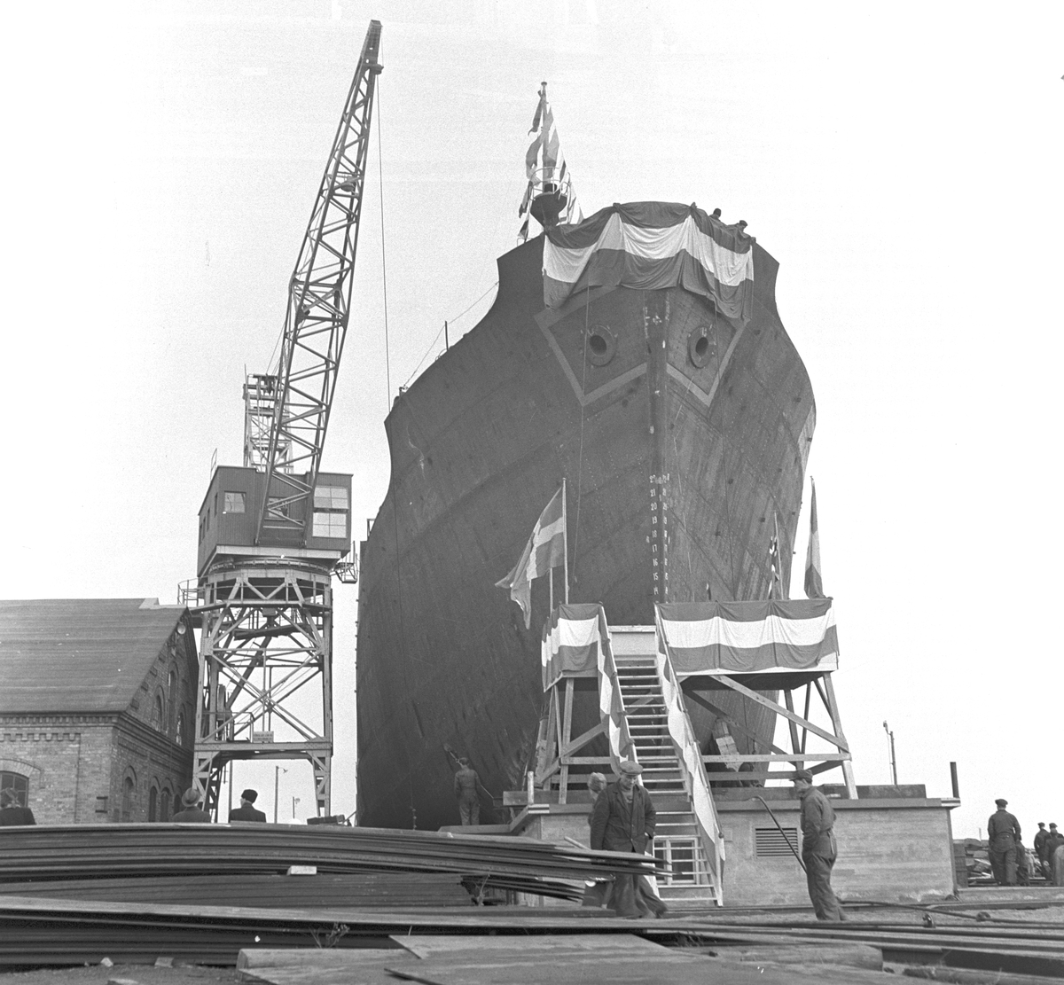 Norskt fartyg. Stapelavlöpning. Den 19 februari 1949. Gävle Varv anlades 1873. Efter en konkurs 1921 bildades Gefle Varfvs och Verkstads Nya AB, som bland annat tillverkade oljecisterner och utrustningar till pappersmassefabriker. På 1940-talet återupptogs skeppsbyggeriet.