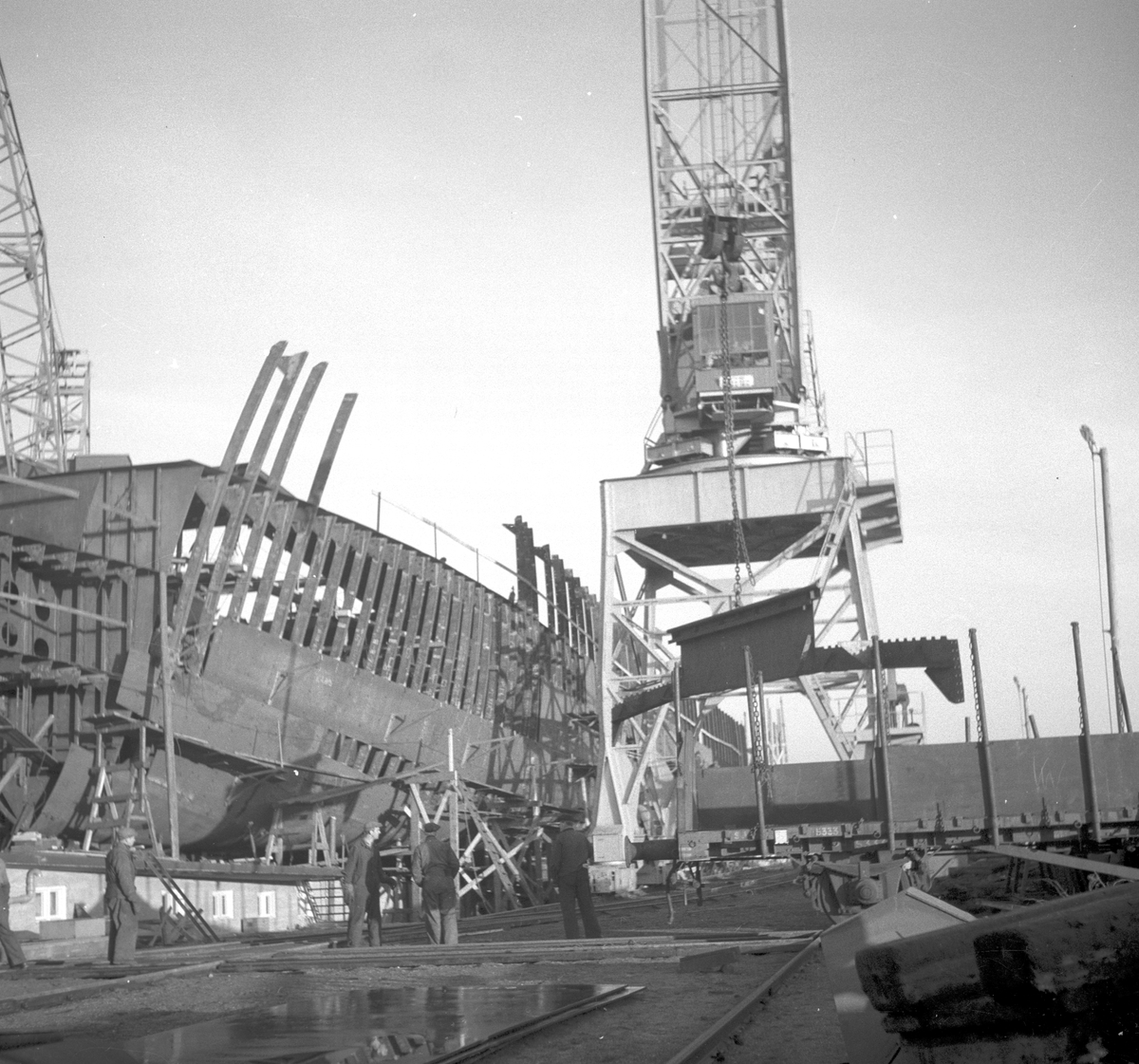 Reportage för Gefle Dagblad. 6 december 1948. Gävle Varv anlades 1873. Efter en konkurs 1921 bildades Gefle Varfvs och Verkstads Nya AB, som bland annat tillverkade oljecisterner och utrustningar till pappersmassefabriker. På 1940-talet återupptogs skeppsbyggeriet.
