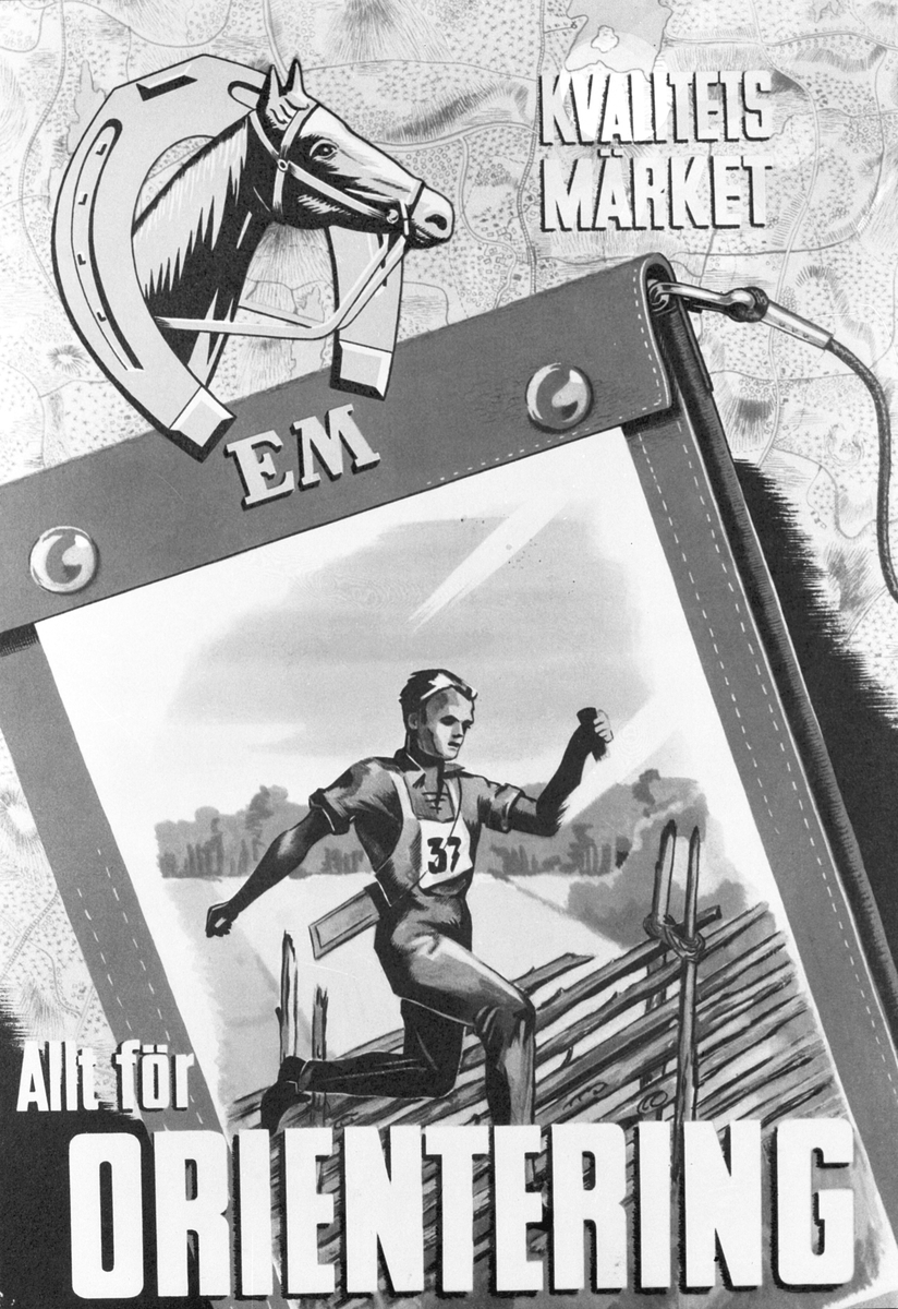 Elof Malmberg AB. Reklamaffisch för orientering. "EM kvalitetsmärket Allt för ORIENTERING"