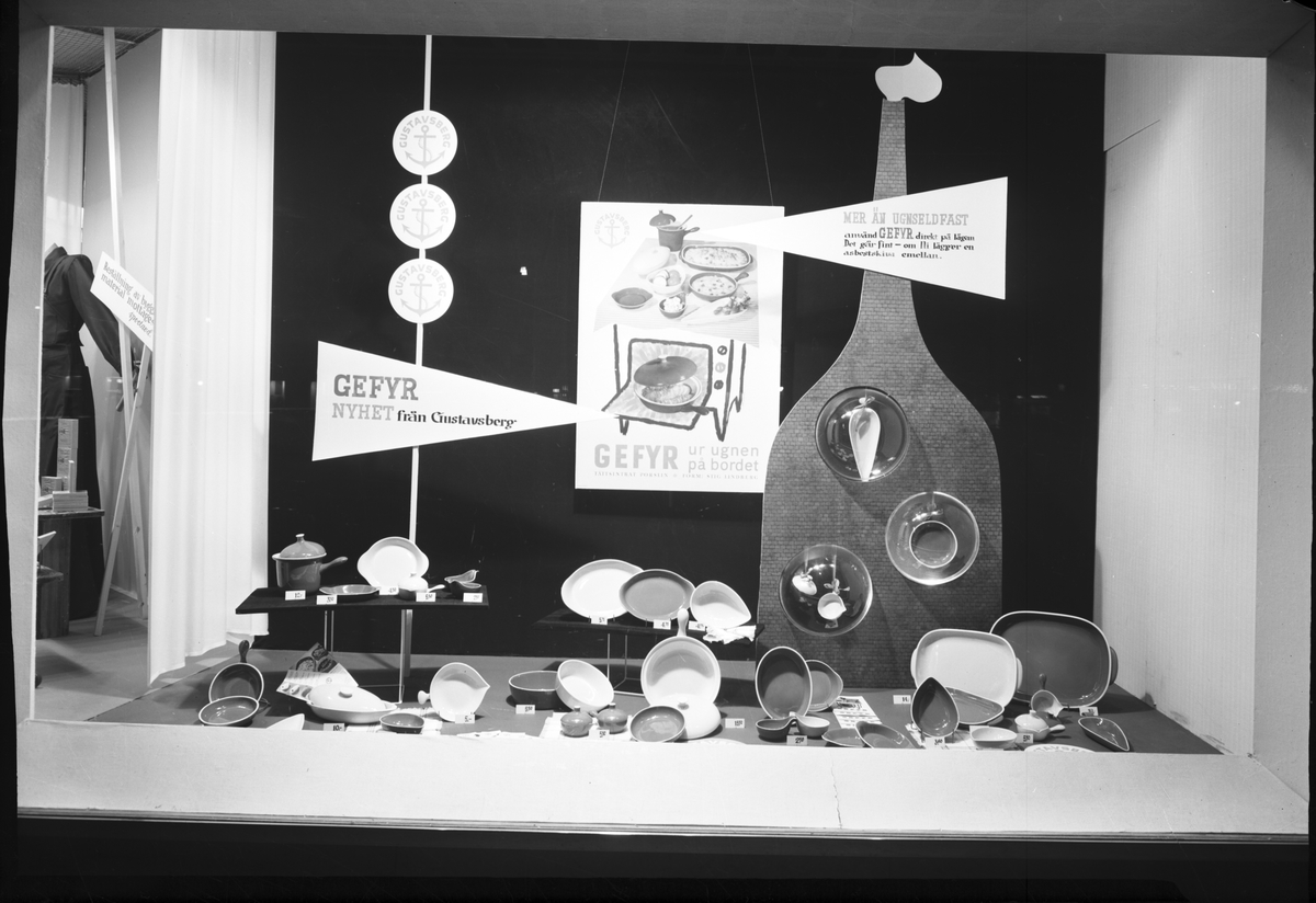 Konsum Alfa Varuhuset. Skyltfönstertemat är "Gustavsberg". Datum 16 september 1953.