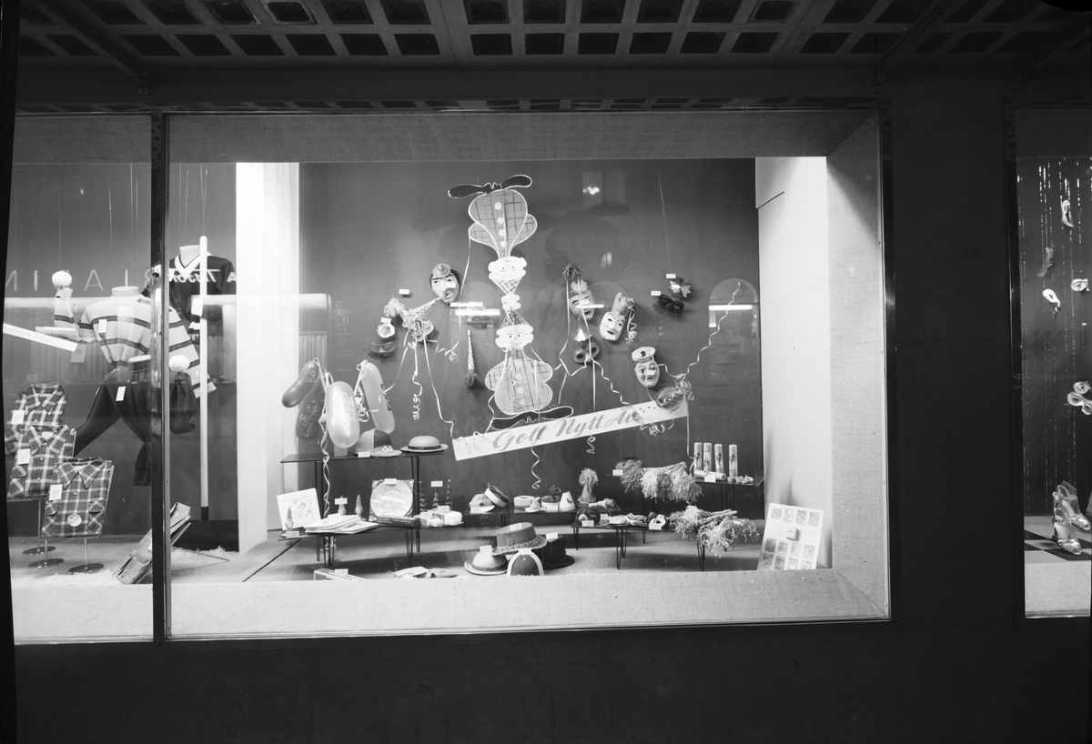 Konsum Alfa Varuhuset. Skyltfönstertemat är "Gott Nytt År". Datum 8 januari 1954.