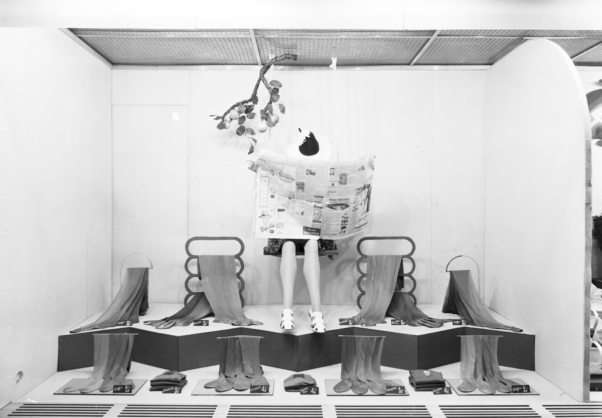 Konsum Alfa Varuhuset. Skyltfönstertemat är "Strumpor"