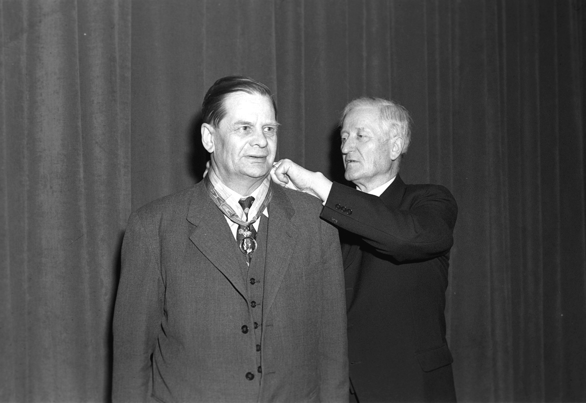 Patriotiska sällskapets guldmedalj utdelas till elektriker på Folkets Hus. 1949. Reportage för Norrlands-Posten.