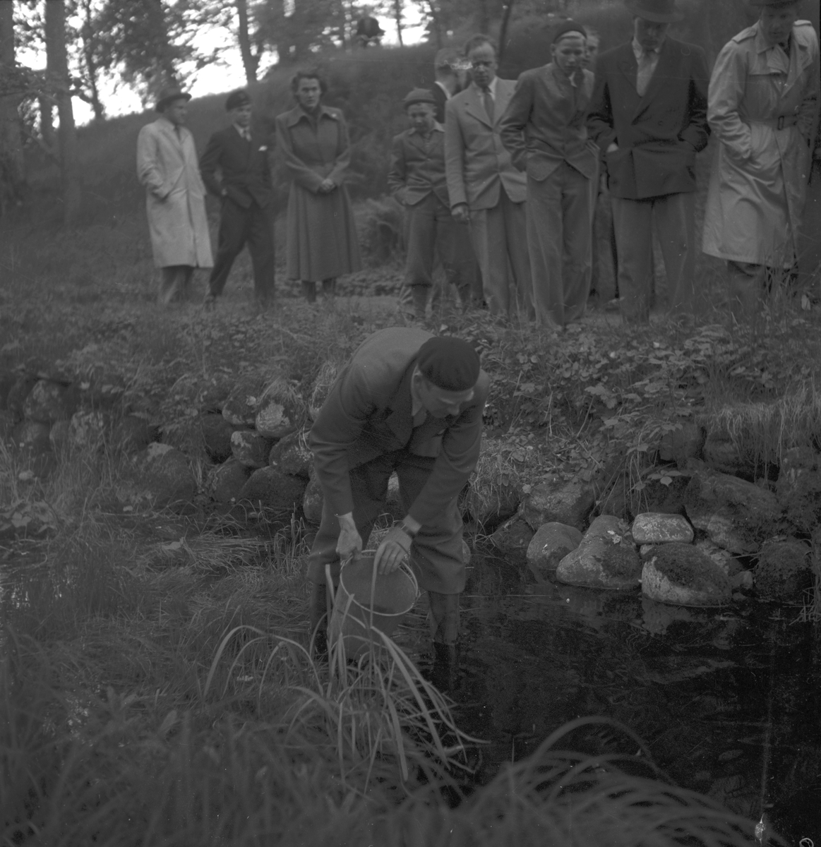 Titel: Stadsträdgården inplantering av laxyngel. Juni 1949.
