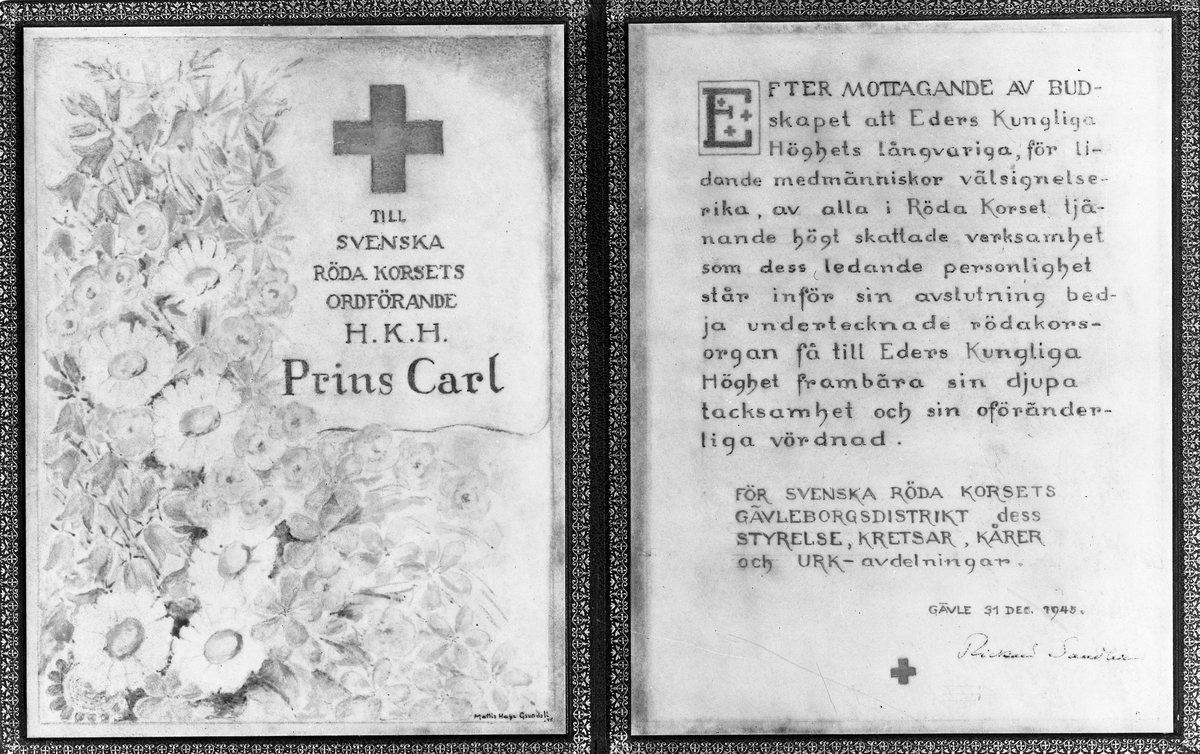 Reproduktion av tackkort till H.K.H. Prins Carl. 28 januari 1946. Från Röda Korset Gävleborgsdistriktet.
