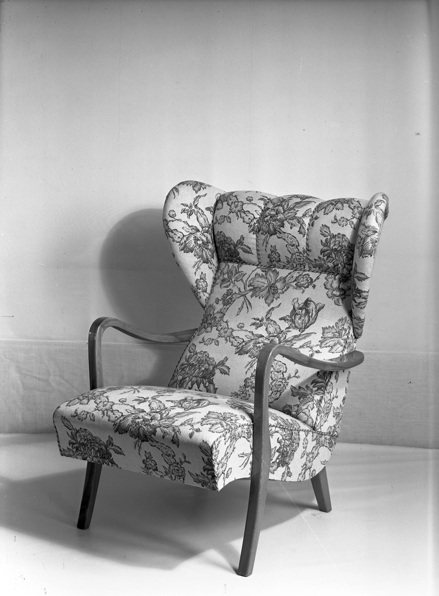 Fåtölj med blommigt tyg. Augusti 1945. Möbelproduktion AB. Upphörde 1992, startade 1899 som Gefle Möbelsnickares Produktionsförening u.p.a, med snickarverkstad vid Södra Kungsgatan 27. Firman utökades 1915, den blev aktiebolag på 1930-talet och flyttades till Södra Kungsgatan 3, nästan hela kvarteret med verkstäder, lager, försäljnings- och utställningslokaler. Efter Söders sanering fick MP nya lokaler vid Södra Kungsgatan. Företaget flyttade på 1980-talet till nytt möbelvaruhus i hörnet Södra Kungsvägen-Österbågen i Hemlingby.