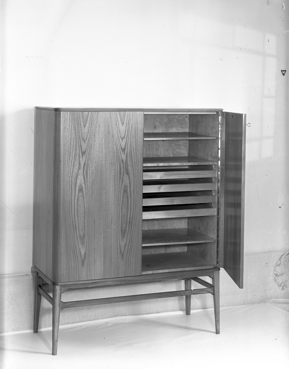 Linneskåp. Augusti 1945. Möbelproduktion AB. Upphörde 1992, startade 1899 som Gefle Möbelsnickares Produktionsförening u.p.a, med snickarverkstad vid Södra Kungsgatan 27. Firman utökades 1915, den blev aktiebolag på 1930-talet och flyttades till Södra Kungsgatan 3, nästan hela kvarteret med verkstäder, lager, försäljnings- och utställningslokaler. Efter Söders sanering fick MP nya lokaler vid Södra Kungsgatan. Företaget flyttade på 1980-talet till nytt möbelvaruhus i hörnet Södra Kungsvägen-Österbågen i Hemlingby.