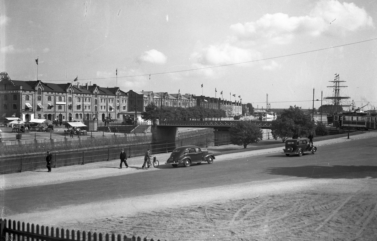 Torghandel på Fisktorget, Briggen Gärdas master syns och en spårvagn svänger upp på Svängbron