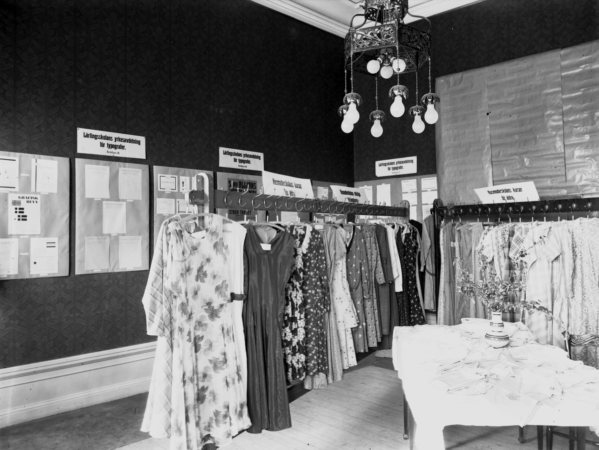 Yrkesskolans utställning i Stadshuset. Husmodersskolans kurser för äldre. Lärlingsskolans yrkesavdelning för typografer.