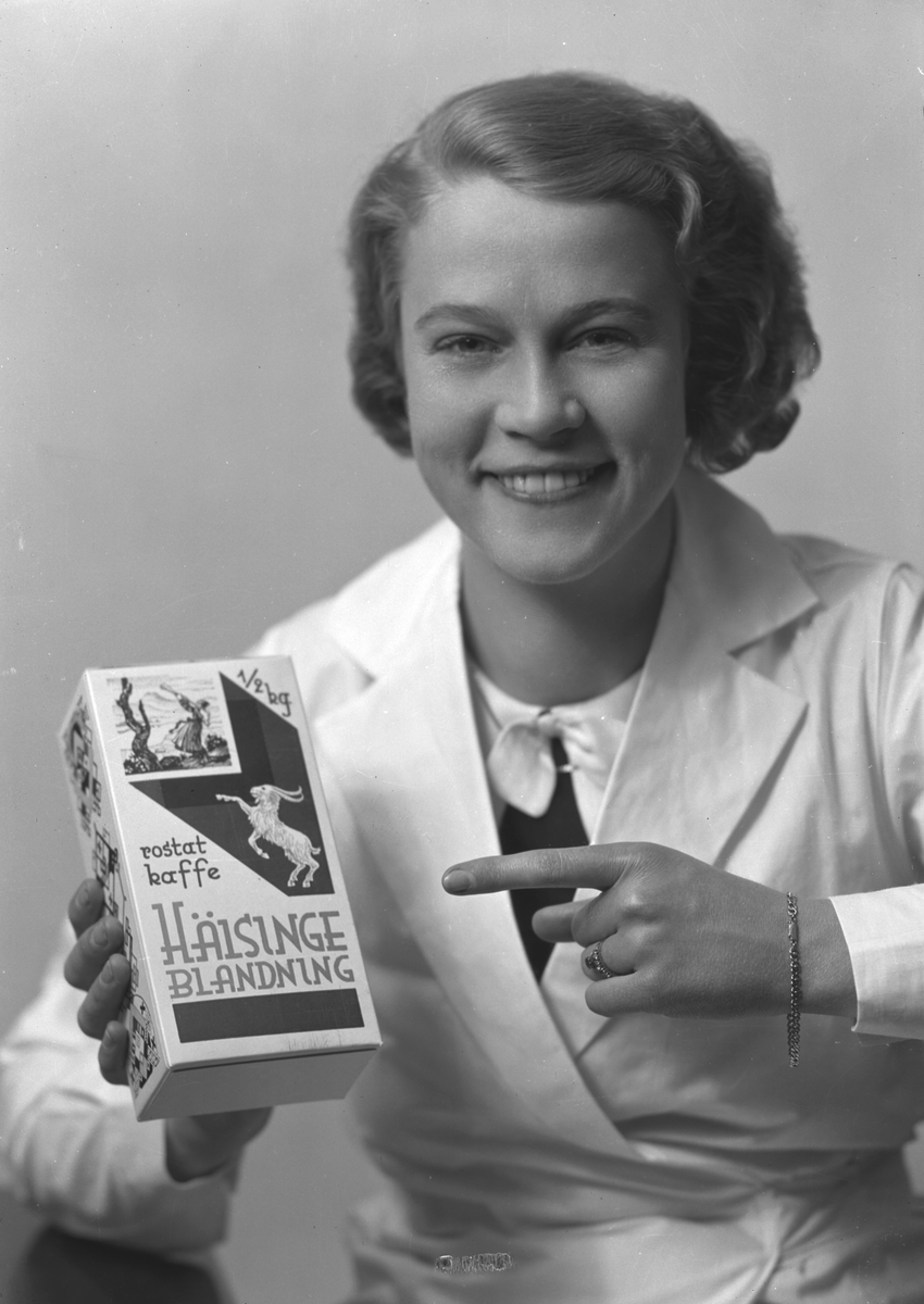 Vict. Th. Engwall & Co, företaget bakom varumärket Gevalia. "Reklamaffisch för rostat kaffe HÄLSINGE BLANDNING"