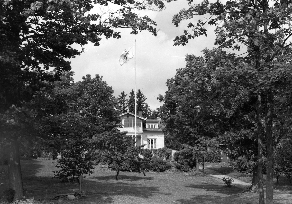I.O.G.T. Reportage från sommarhemmet Lindesberg på Norrlandet. 10 juli 1950. Invigt juni 1940. Ägt av G.G.I.K. Godtemplarordens flagga är hissad. Lindesberg låg vid viken mellan Frivy, Lervik och Kullsand. Revs när hamnen byggdes ut.
