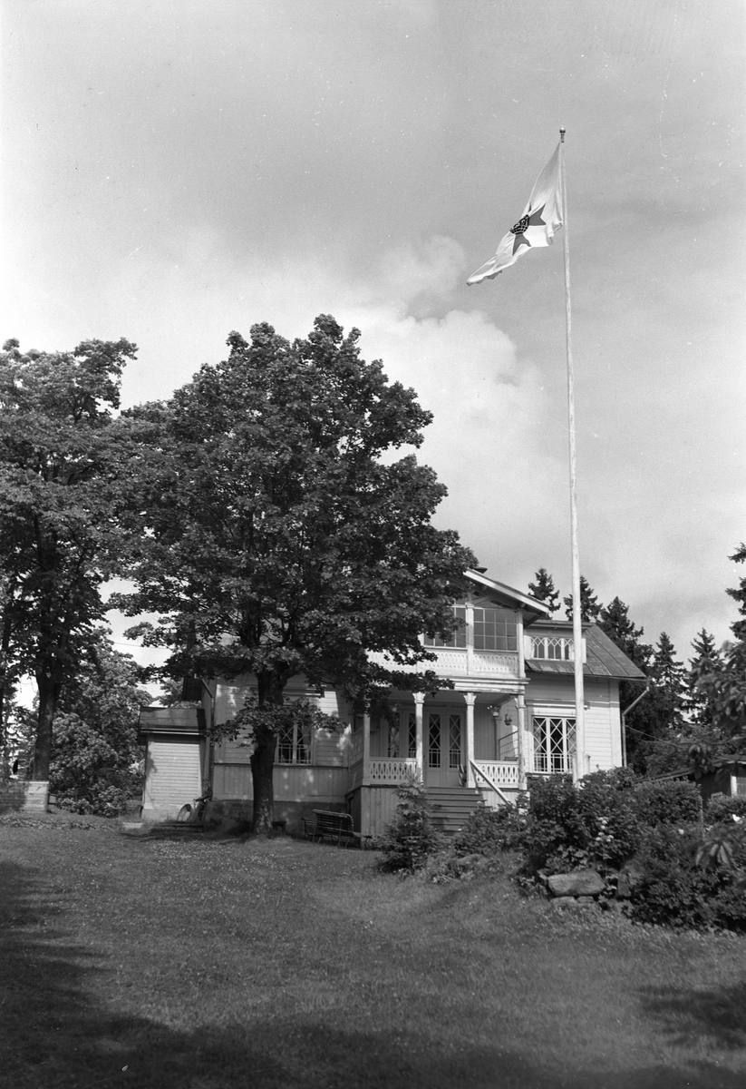 I.O.G.T. Reportage från sommarhemmet Lindesberg på Norrlandet. 10 juli 1950. Invigt juni 1940. Ägt av G.G.I.K. Godtemplarordens flagga är hissad. Lindesberg låg vid viken mellan Frivy, Lervik och Kullsand. Revs när hamnen byggdes ut.