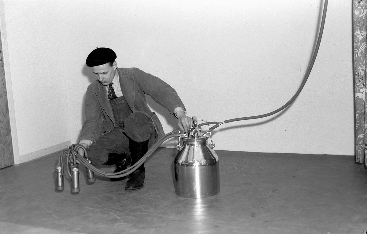Atsa, demonstration av mjölkningsaggregat. 2 mars 1950. År 1897 grundades firman AB. Gefle Åkerredskap, vilket firmanamn år 1931 ändrades till Atsa AB. Bolagets tillverkningar utgörs av lantbruksmaskiner med mjölk- maskiner, separatorer, radsåningsmaskiner och häst- räfsor som specialitet. Tillverkar även dragpressningar.