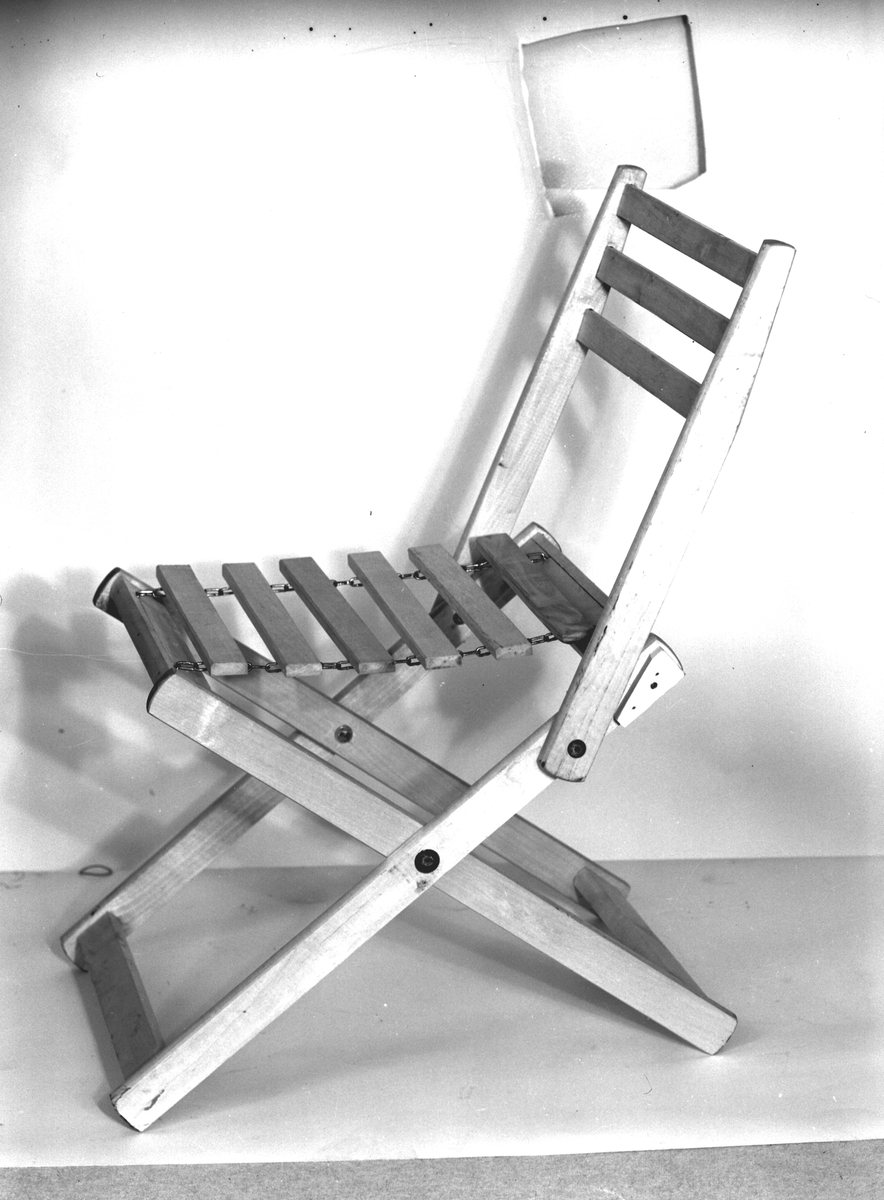 Malmbergs startades 1905 av Elof Malmberg. Blev en av Sveriges ledande producenter av artiklar för idrott, jakt, fiske, skytte och friluftsliv. På bild hopfällbar trädgårdsstol