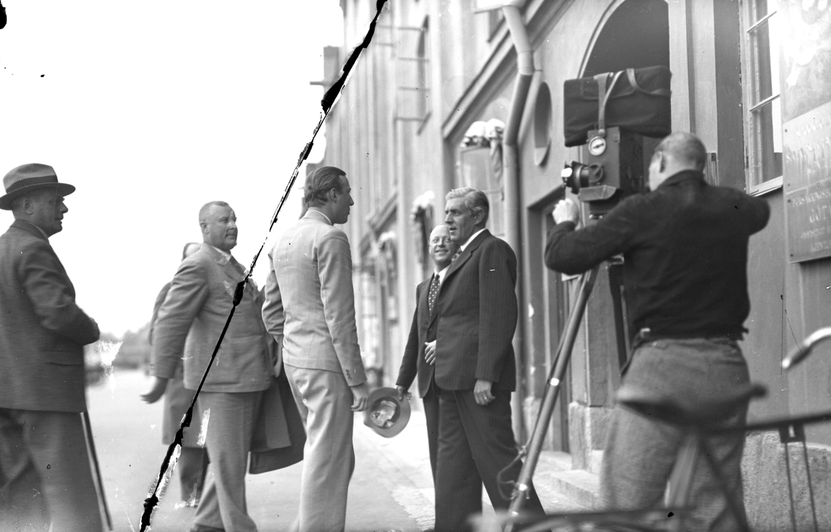 Möte på trottoaren utanför Ahlgrens Tekniska Fabrik.