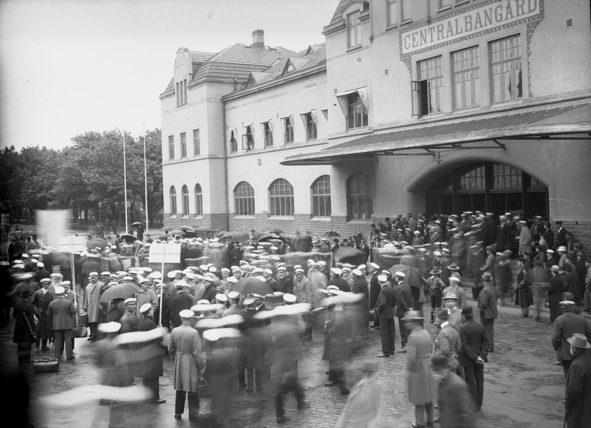 Studenter vid Centralbangården, tar emot besökare som kommer med tåget