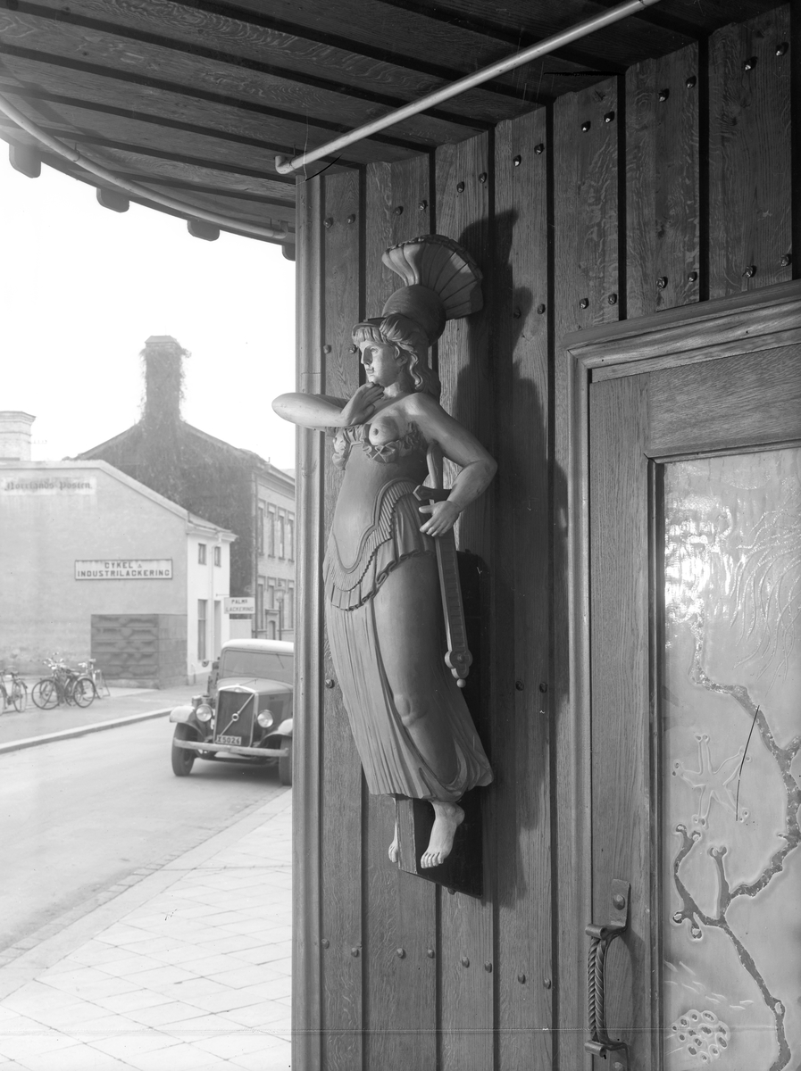 Grand Central Hotell, Gävle. Staty utanför "Skeppet". Den 5 november 1949