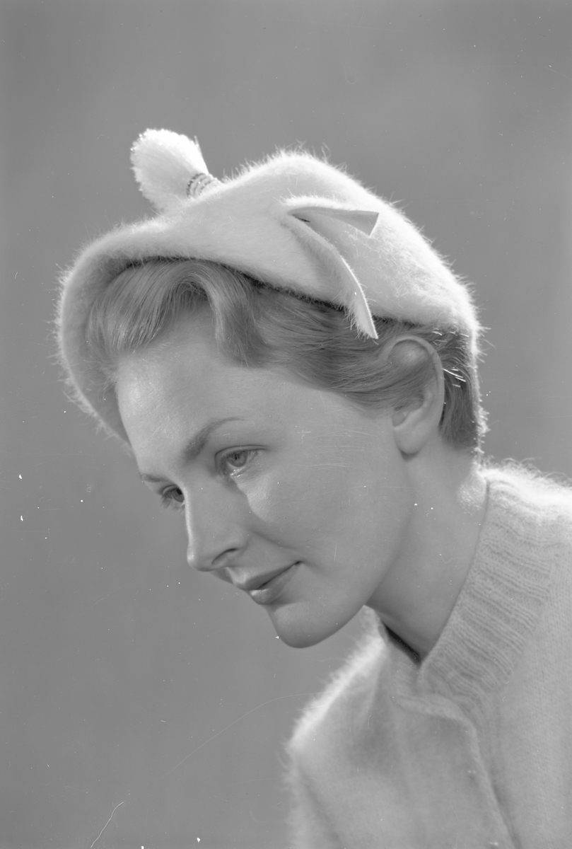 Kvinna i hatt. Reklambild för L. Haglund & Co, med varumärket Elhå. Grundades som en affär för mössor, hattar och pälsvaror av Lars Haglund 1872.