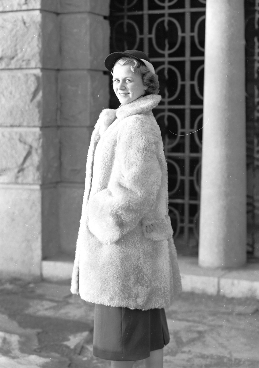Kvinna i pälsjacka. Reklam för L. Haglund & Co, med varumärket Elhå. Grundades som en affär för mössor, hattar och pälsvaror av Lars Haglund 1872. Fotografiet är taget utanför entrén till Strömvallen på Kungsbäcksvägen 23.
