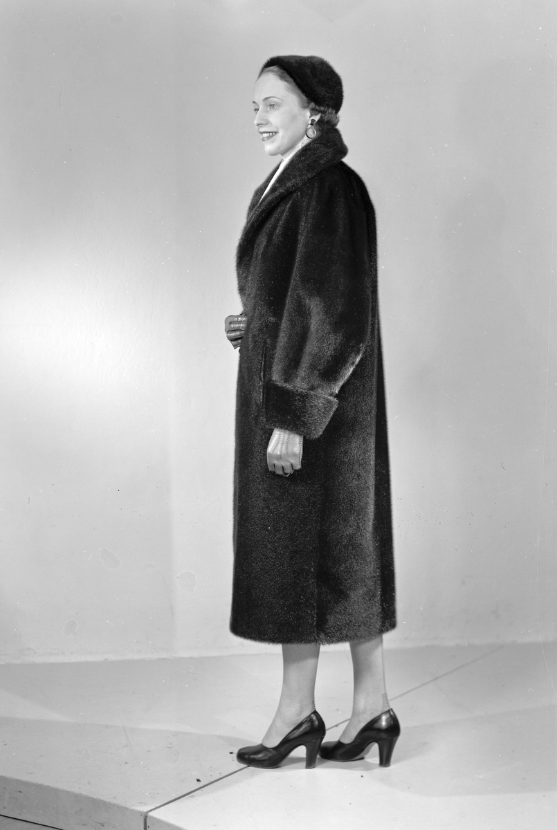 Pälskappa och hatt. L. Haglund & Co, med varumärket Elhå. Grundades som en affär för mössor, hattar och pälsvaror av Lars Haglund 1872.