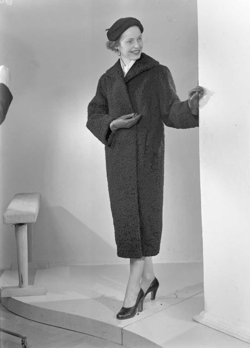 Pälskappa och hatt. L. Haglund & Co, med varumärket Elhå. Grundades som en affär för mössor, hattar och pälsvaror av Lars Haglund 1872.