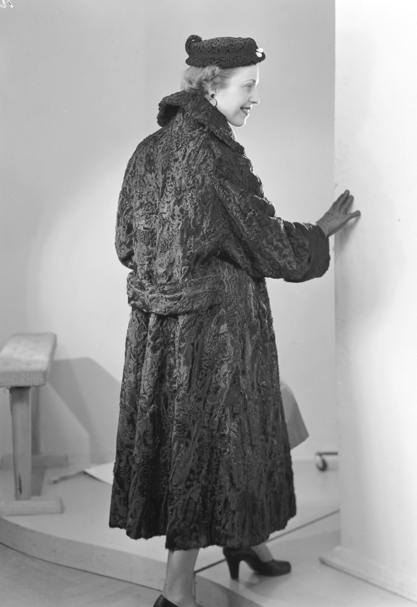 Pälskappa och hatt. L. Haglund & Co, med varumärket Elhå. Grundades som en affär för mössor, hattar och pälsvaror av Lars Haglund 1872.