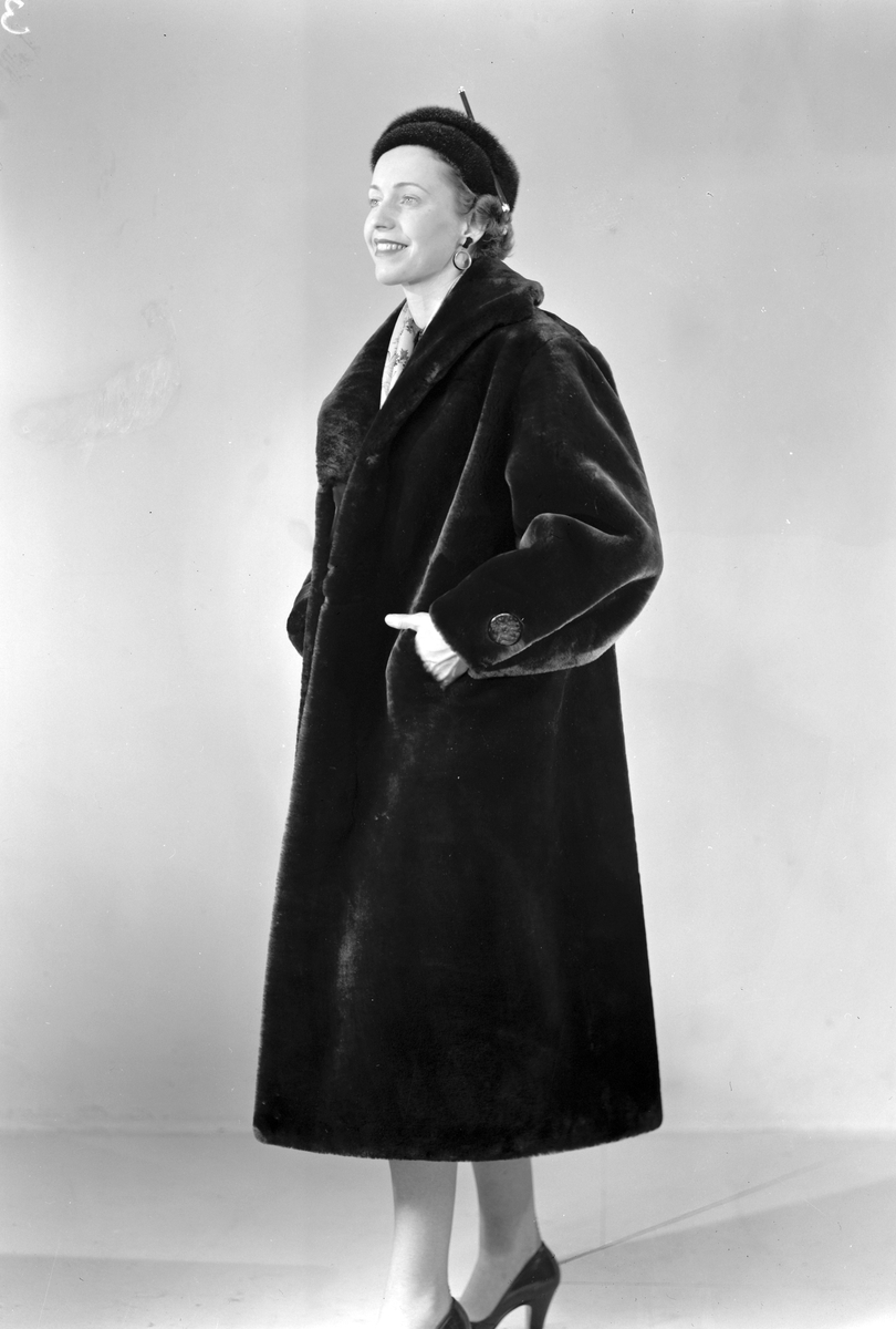 Pälskappa och hatt. L. Haglund & Co, med varumärket Elhå. Grundades som en affär för mössor, hattar och pälsvaror av Lars Haglund 1872.