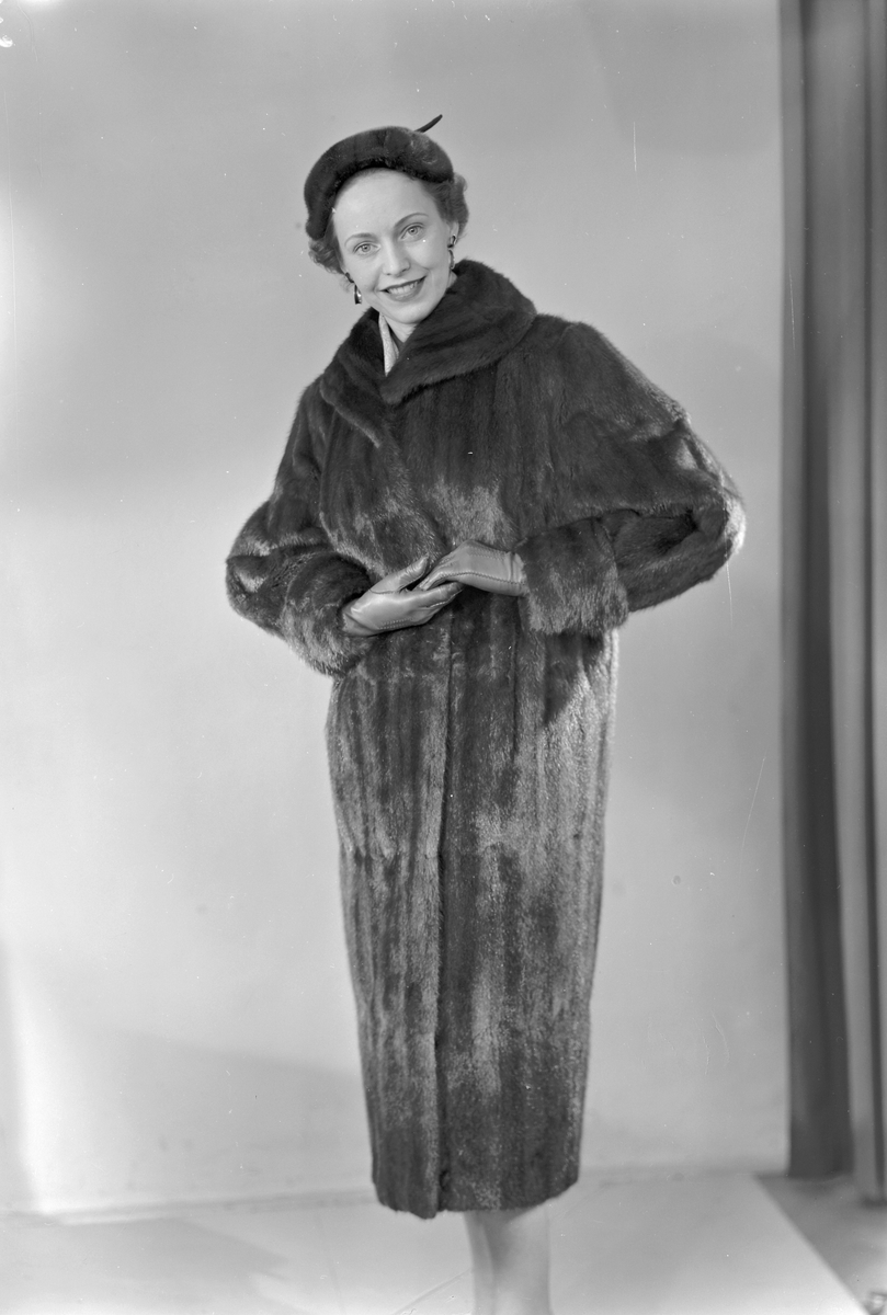 Pälskappa och hatt. L. Haglund & Co, med varumärket Elhå. Grundades som en affär för mössor, hattar och pälsvaror av Lars Haglund 1872.