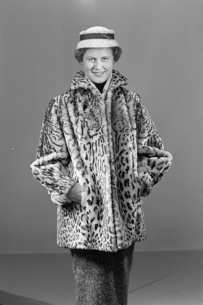 Pälsjacka med hatt. L. Haglund & Co, med varumärket Elhå. Grundades som en affär för mössor, hattar och pälsvaror av Lars Haglund 1872.