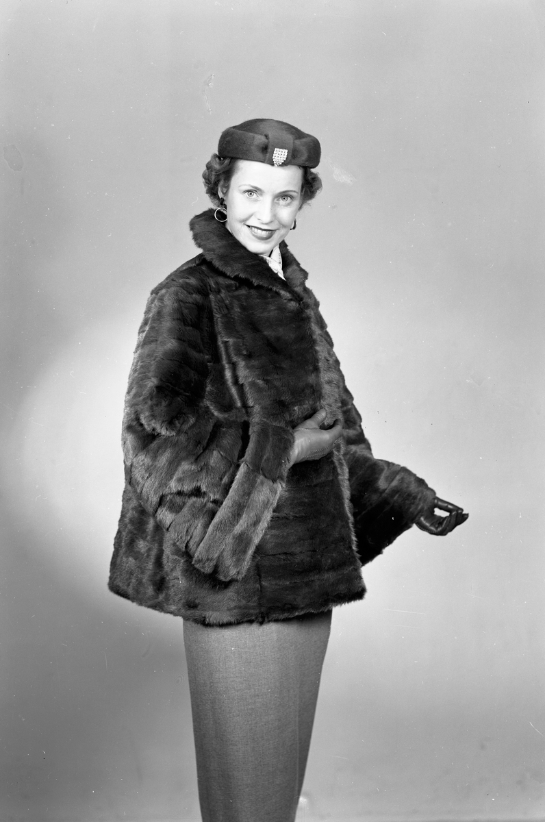 Pälsjacka och hatt. L. Haglund & Co, med varumärket Elhå. Grundades som en affär för mössor, hattar och pälsvaror av Lars Haglund 1872.