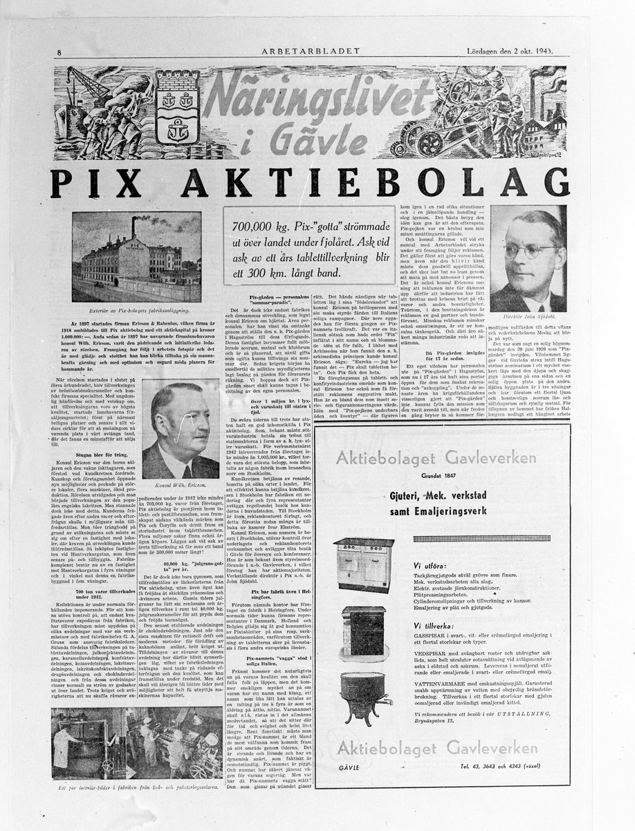 En sida av Arbetarbladet Lördagen den 2 oktober 1943. Näringslivet i Gävle. "Pix Aktiebolag".