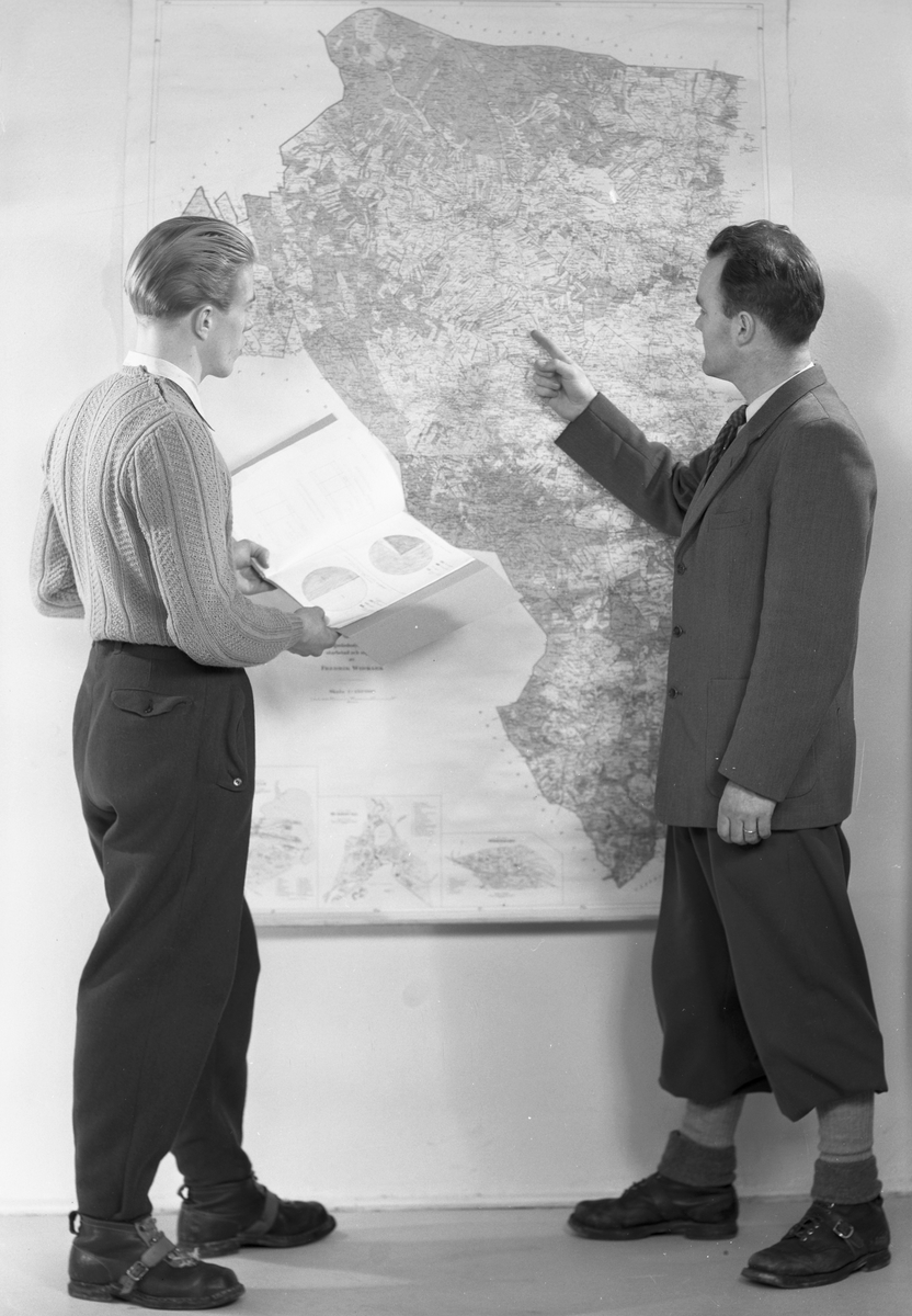 Män läser karta. Skogsvårdsstyrelsen. Januari 1951