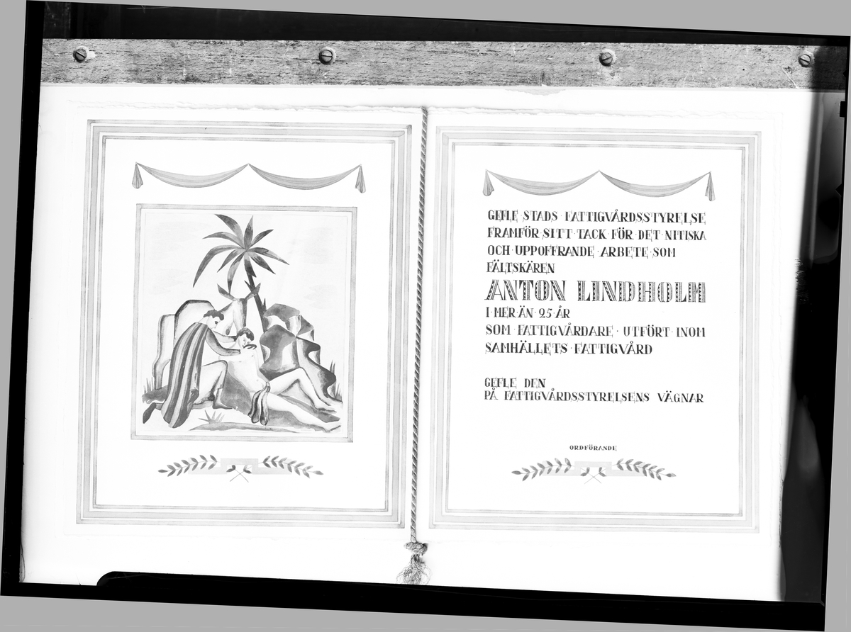 Diplom. "Gefle Stads Fattigvårsstyrelsen framför sitt tack för det nitiska och uppfostrande arbete som Fältskären Anton Lindholm i mer än 25 år som fattigvårdare utfört inom samhällets fattigvård. Gefle den ....... på fattigvårdsstyrelsens vägnar".