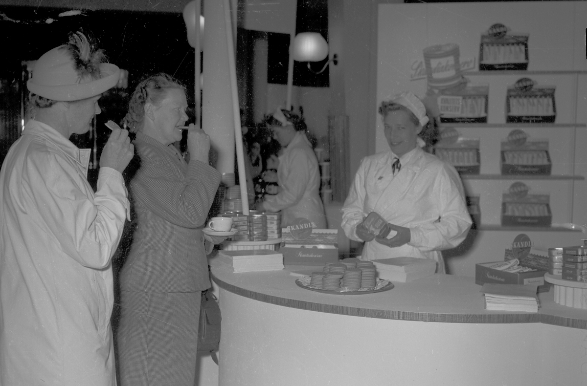 Provsmakning på Folkets Hus för Konsum Alfa. Den 29 september 1949. Damen i mitten (utan hatt) är Anna Löfberg.