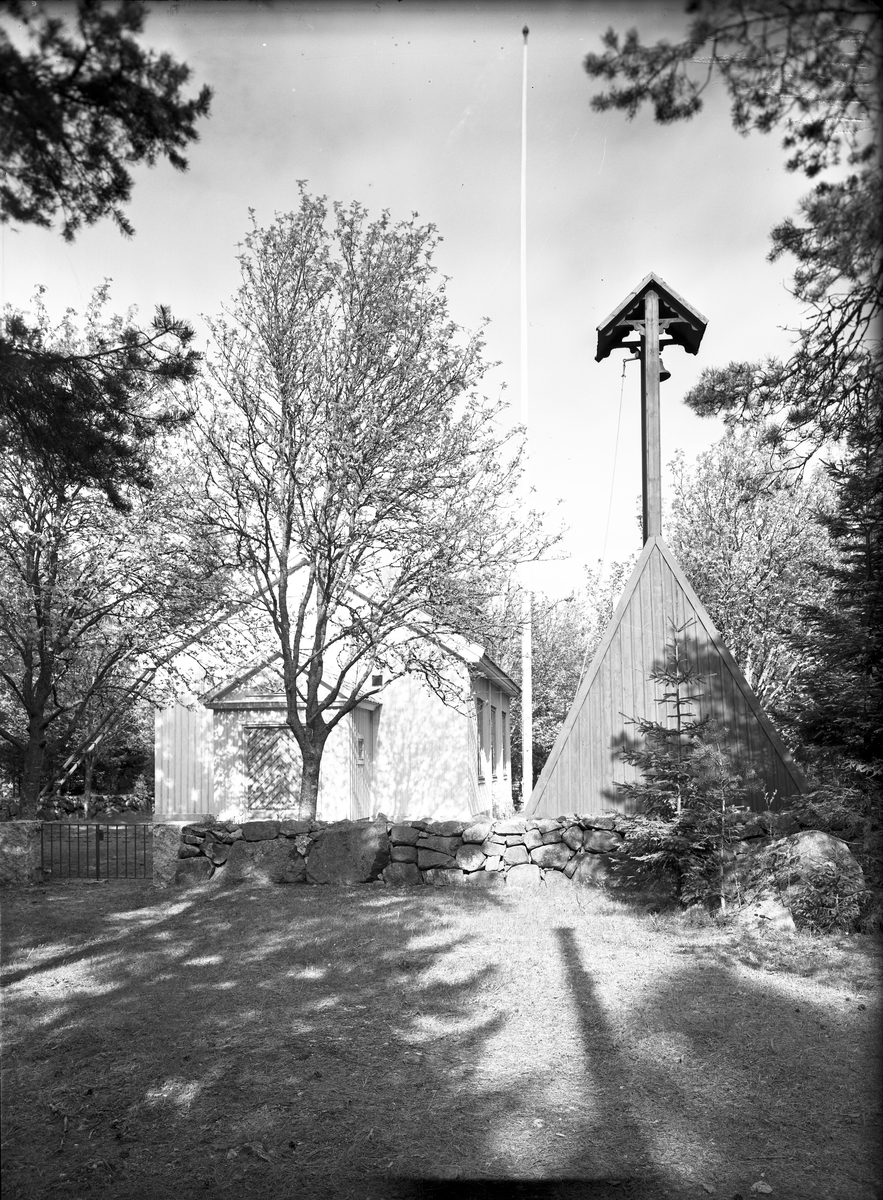 Böna Kapell. 28 maj 1945. Beställt av fröken Nordin,Bönan. Uppfördes år 1843. "Husfäderna i fisklägrena Bönan och Utvalnäs" stod för arbetet och Gävle stad bidrog med timret. 1892 överlämnades kapellet till Gävle stad. På 1870-talet byggdes en klockstapel. Det enkla träkapellet har rektangulärt långhus och vidbyggt vapenhus i väster. Kyrkorummets sydöstra hörn är avdelad till sakristia. Ingång i väster, via vapenhuset. Altarväggen pryds av ett ramverk som snidades av fiskaren Per Wickman när kapellet byggdes. Till vänster om altaret står predikstolen med en Kristustavla som bakgrund. Mikaelidagen 1952 invigdes en dopfunt i röd Gävlesandsten, ritad av stadsarkitekt Sven Wranér, Gävle, (1894-1965). När Gävle församling delades 1916 kom Norrlandet med Bönan och Utvalnäs att tillhöra Heliga Trefaldighets församling. Inför kapellets 100-årsdag gjordes en renovering med tillbyggnad av sakristia och vapenhus, efter förslag av Sven Henrik Wranér, och kapellet återinvigdes 27 juni 1943. Vapenhuset utvidgades 1972 och där fick en skrudkammare plats.
