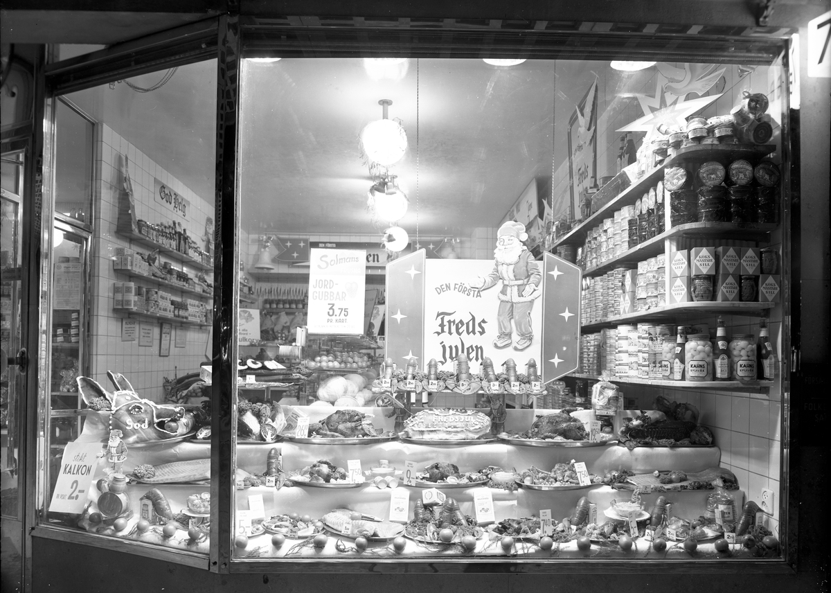 Julskyltning i charkuteributiken i Konsum Alfa varuhus. Första julen i fred efter andra världskriget, 1945.