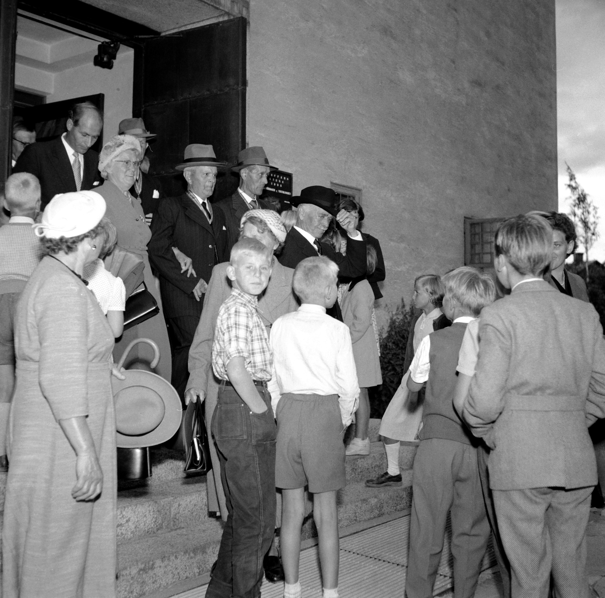 På väg ut från medaljutdelningen i Staffans kyrka, Brynäs. 100 -årsjubileum. 1855-1955. Korsnäs AB.
