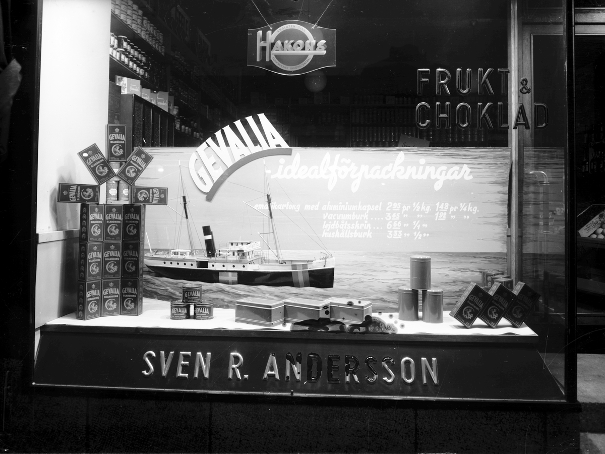 Sven R Anderssons skyltfönster."Gevalia idealförpackningar", "Hushållsburk 3:33".