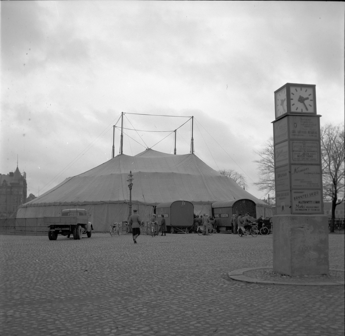 På Fisktorget/Hamntorget står cirkusvagnarna vid cirkustältet.