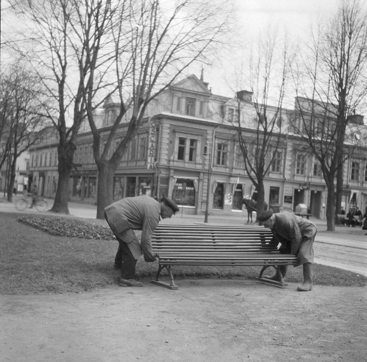 Parkbänkarna är snart på plats i allén. Oscaria skoaffär i bakgrunden.