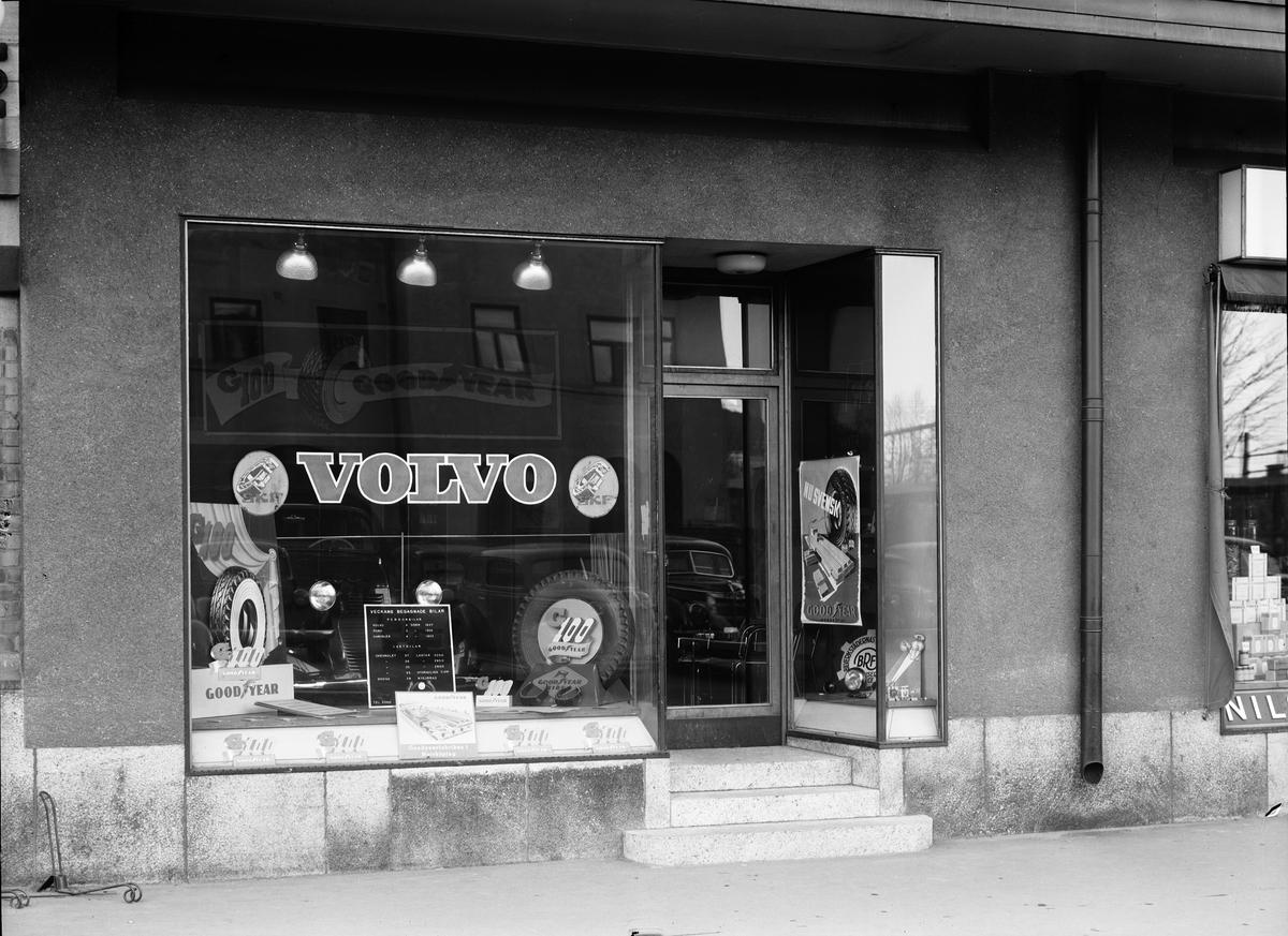 Foto av skyltfönster med reklam för "Volvo", på Centralplan 5. I samma lokal fanns senare AB Norrlands Elektriska. Till höger skymtar Nils Grohmans speceributik. Foto 15 april 1939.
