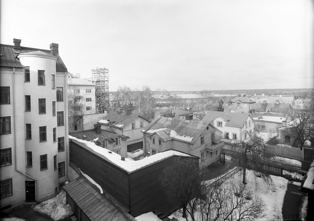 Vy från kvarteret Prima mot nordöst. Tvåvåningshuset i centrum är Norra Köpmangatan 29. Den 17 mars 1954.