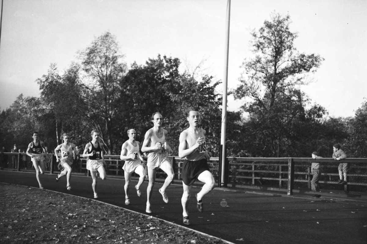 Strömvallen, 1000 meter löpning. Den 26 september 1953. Dan Waern leder, Olle Åberg trea och som femma Sune "Hållsta" Karlsson.